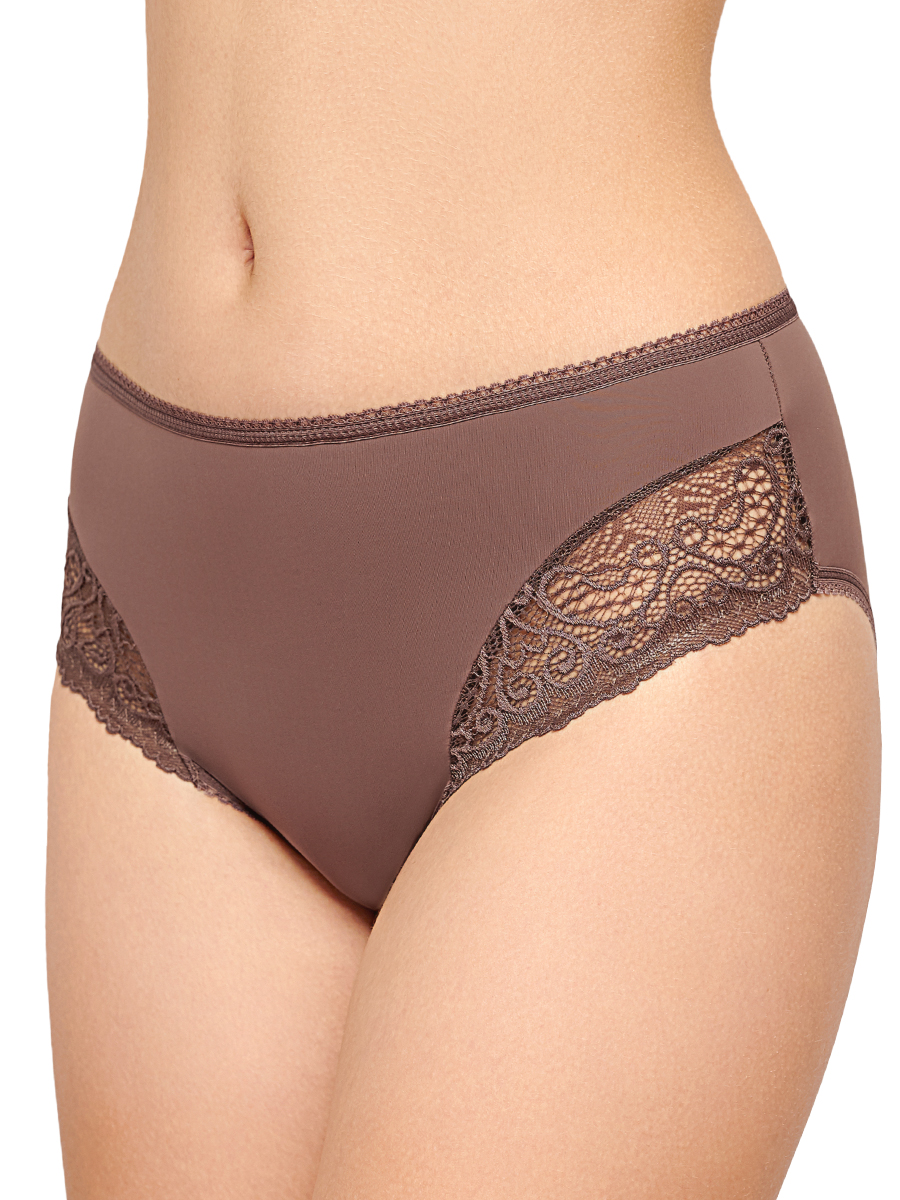 Трусы классические со средней посадкой. Задняя деталь из хлопка. Передняя деталь кружевная, с треугольной хлопковой вставкой. Пояс обработан эластичной тесьмой.