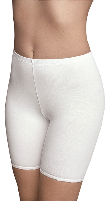 Удлинённые панталоны с высокой линией талии. Модель без кружева. Пояс обработан в подгиб. Низ изделия обработан на плоскошовной машине.
