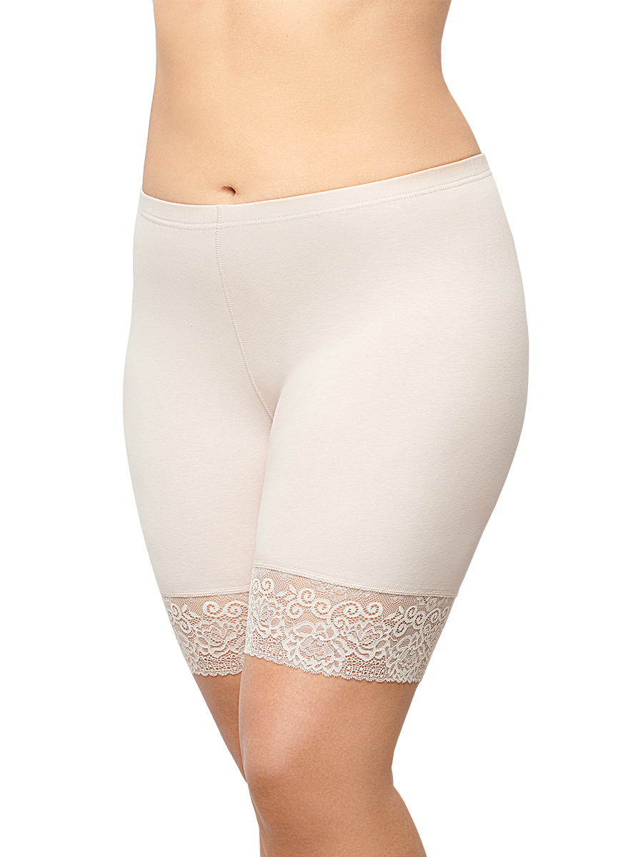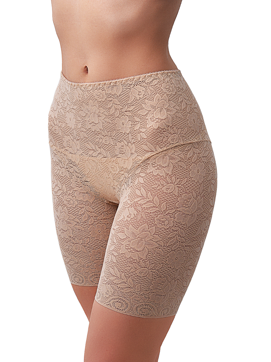 Удлинённые панталоны с высокой линией талии. Низ изделия украшает широкое кружево с цветочным рисунком, за счёт чего модель выглядит нарядно.