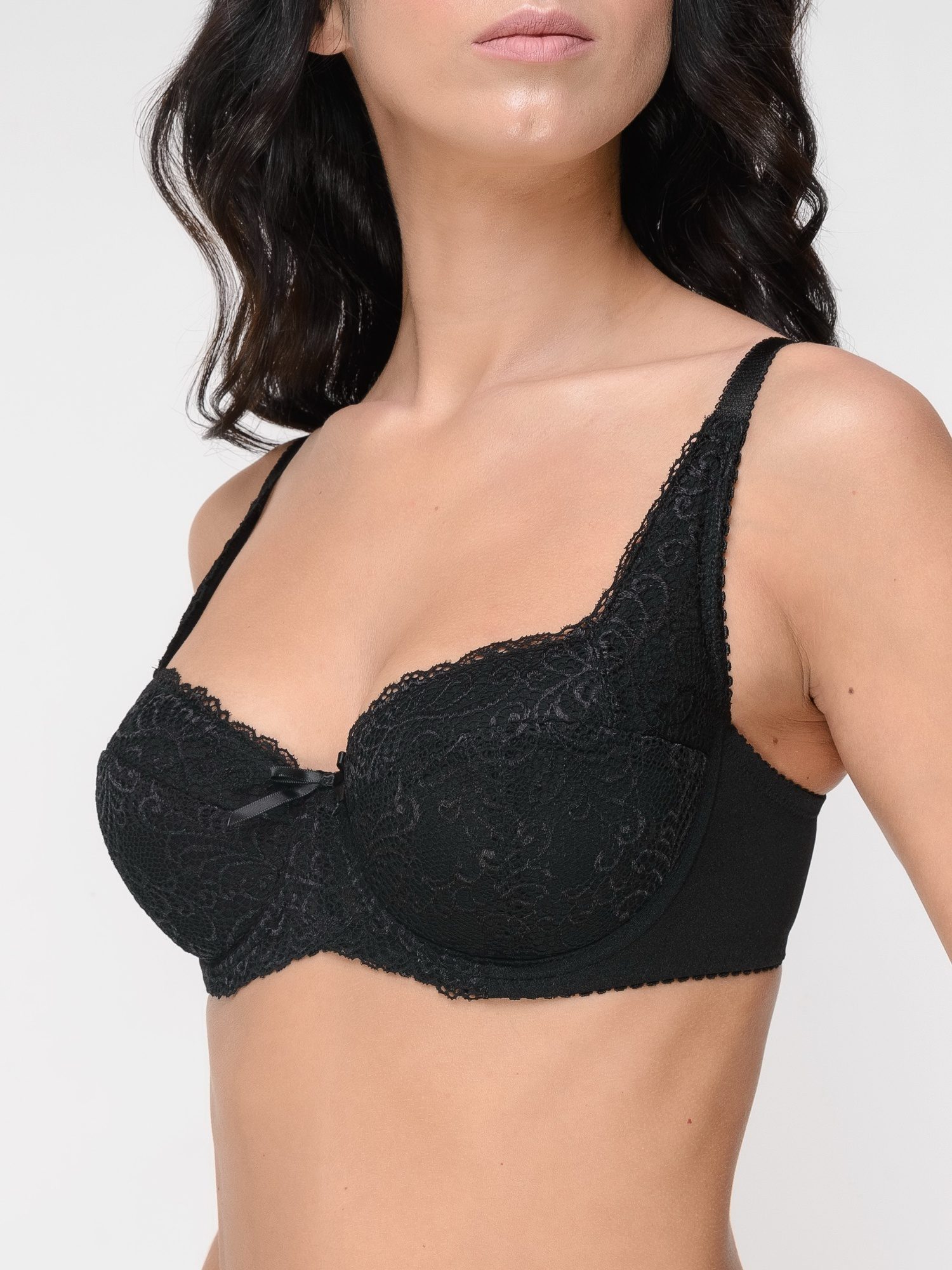 Бюстгальтер выполнен из эластичного полотна в сочетании с эластичным кружевом, на каркасах и стане. Чашки выполнены из кружева, на дубляже, внутренняя поверхность – хлопок. Верх чашки выполнен из двух кружевных деталей, создающих красивый вырез декольте в форме «каре». Бретели из эластичной ленты с регулировкой длины сзади, застёжка сзади на крючки и петли. Функциональная и красивая модель для тех, кто ценит комфорт.
