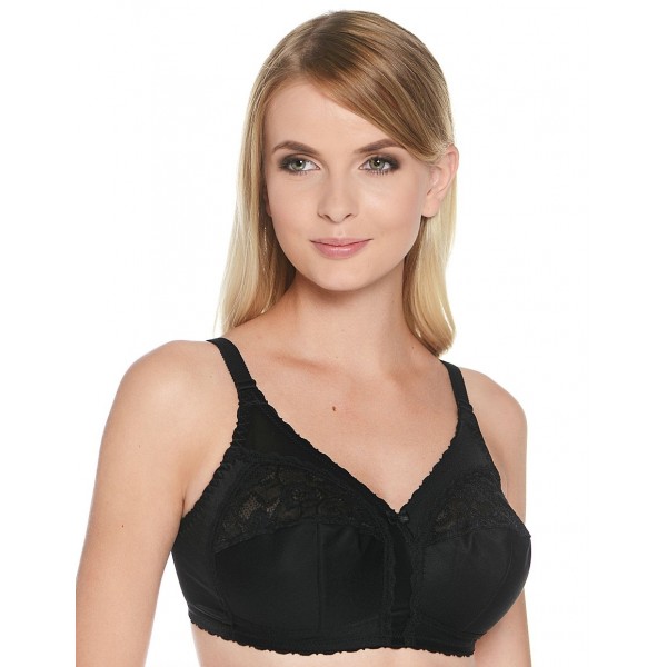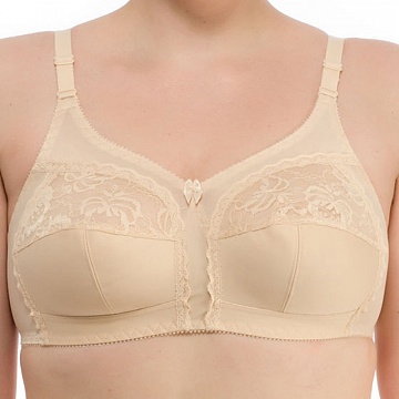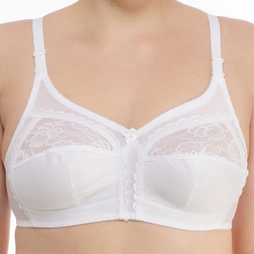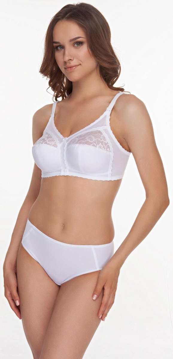 Бюстгальтер из неэластичного кружевного ламинированного полотна, неэластичного и эластичного трикотажного полотна, без каркасов. Нижние детали чашек из неэластичного трикотажного полотна, ламинированного хлопком. Отделка-узкое кружево и бантик.