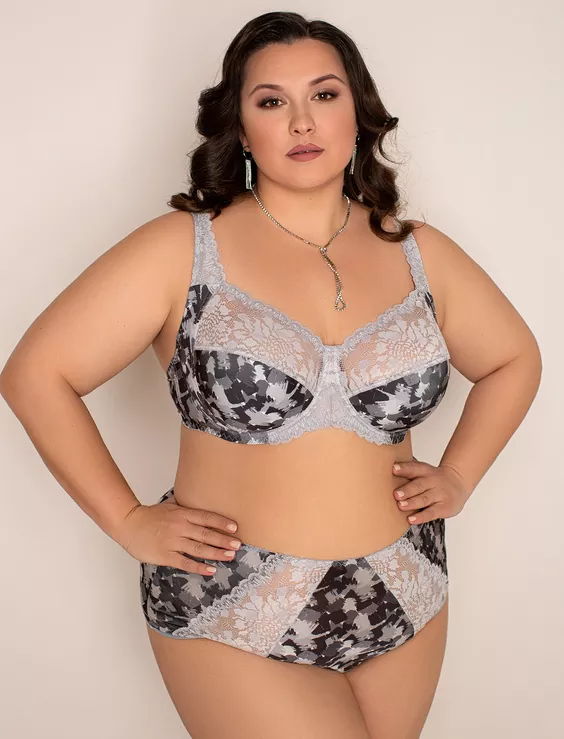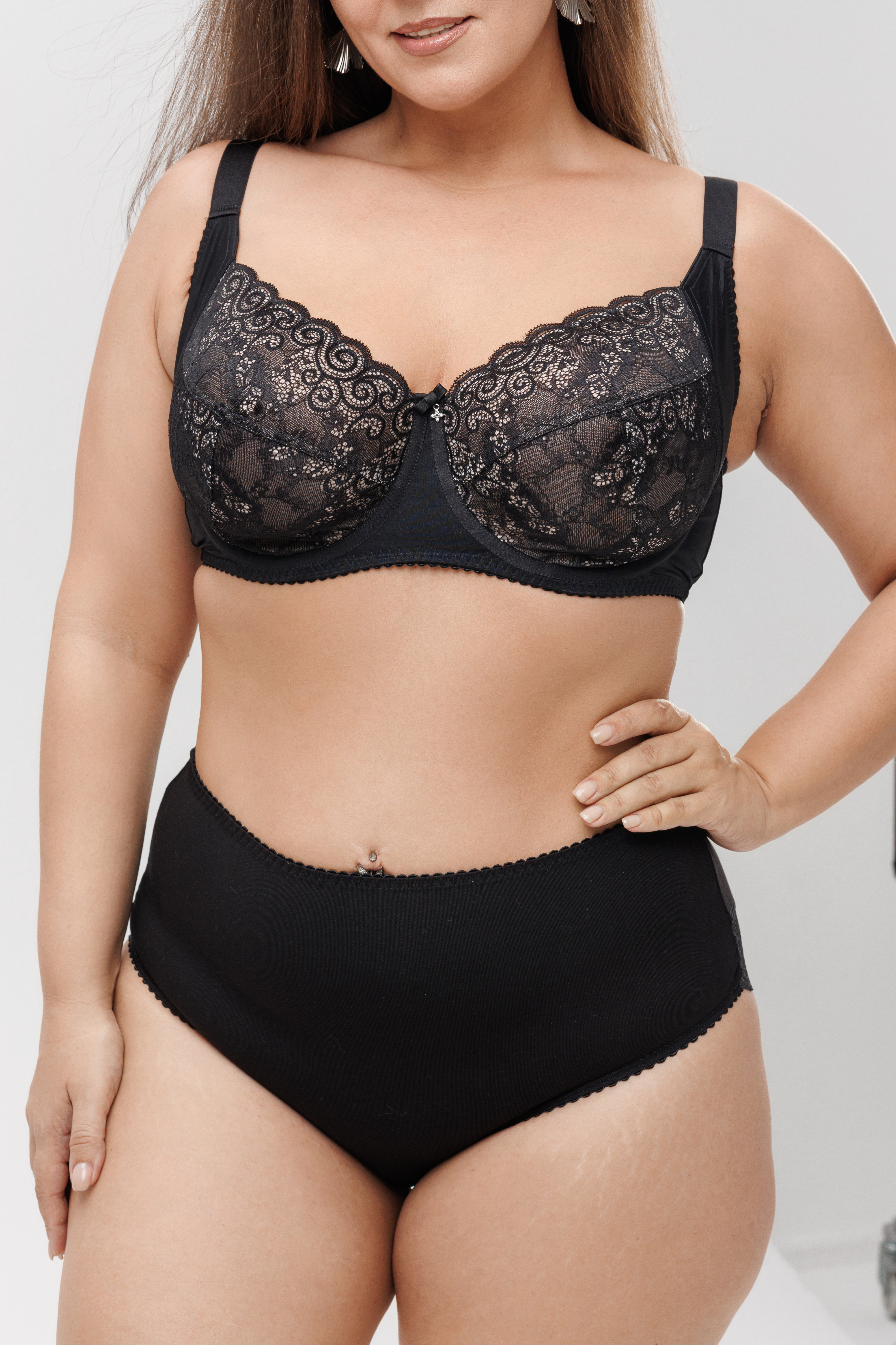 Мягкая чашка из неэластичного функционального трикотажного полотна, комбинированная эластичным кружевом. Бюстгальтер на каркасах, крой чашек и бретелей выполнен с учетом необходимости поддержки большой пышной груди, внутренняя подкладка чашек выполнена из хлопкового полотна.