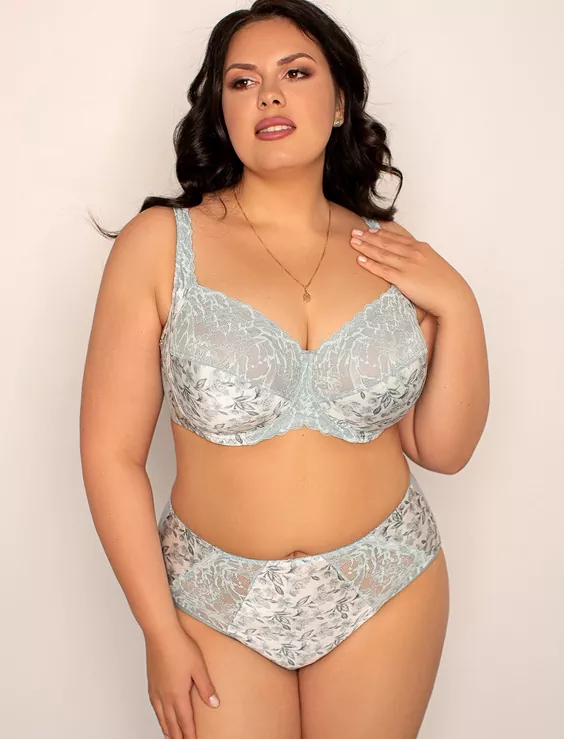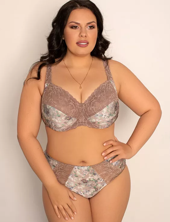Мягкая чашка из эластичного кружева и эластичной микрофибры. Чашка внутри дублирована хлопком. В модели предусмотрены подгрудные косточки. Верх чашки и пояс бюстгальтера выполнены с дополнительным нижним слоем из эластичной сетки с целью улучшения формоустойчивости, что актуально для больших размеров.