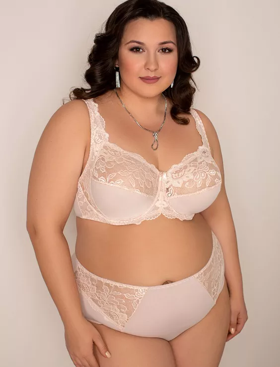 Минимайзер с глубокими чашками на каркасе и широким поясом. Верхние чашки из плотного эластичного ажурного кружева накладываются на другую конструкцию - тройное диагональное сечение, из менее эластичного гладкого полотна. Чашки формируются на широком стане. Пояс бюстгальтера плотный и широкий.