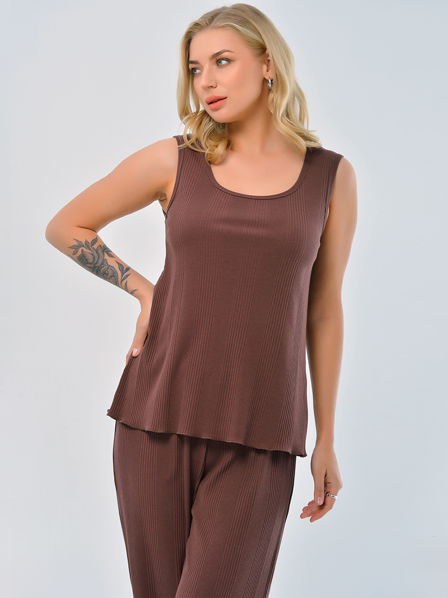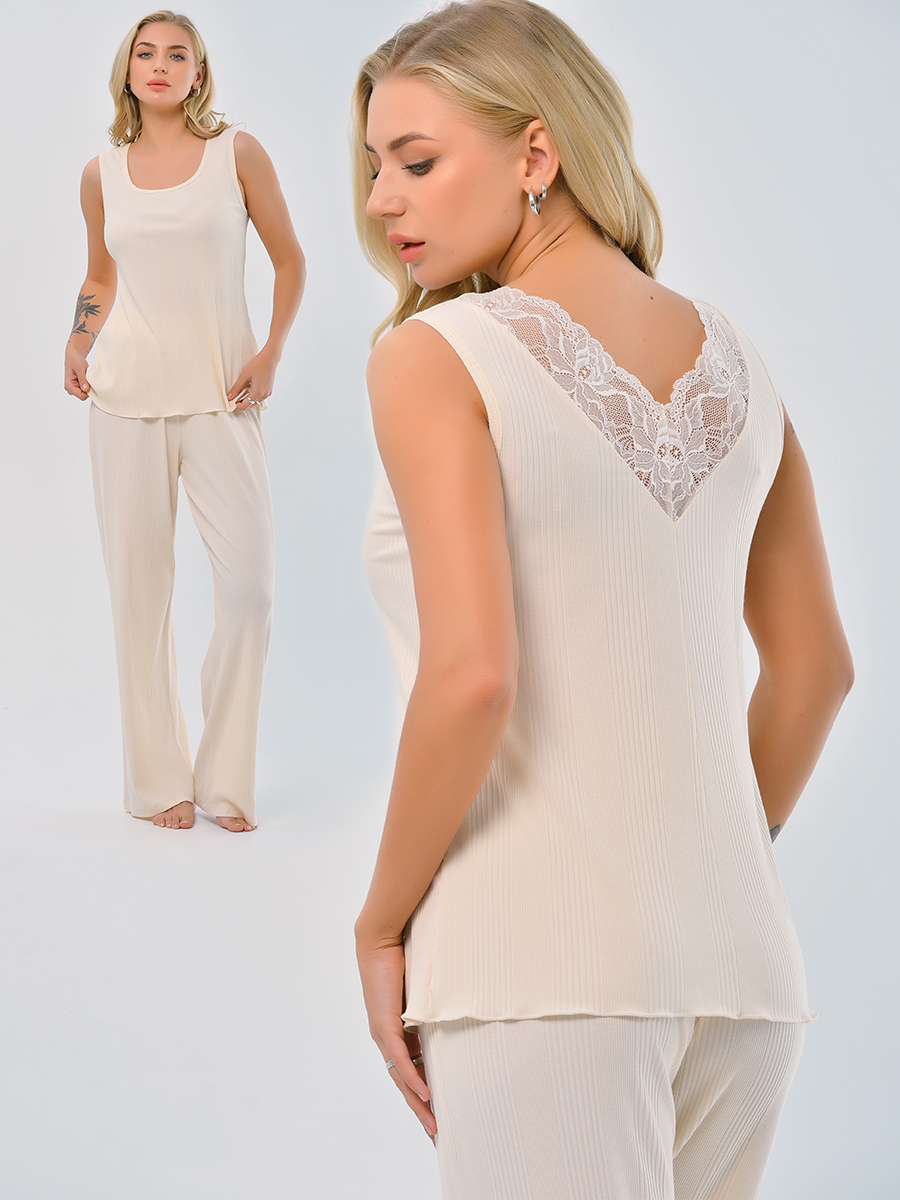 Изящная модель базовой майки с кружевным V образным вырезом на спинке. Плавные линии модели, кружевной акцент на спинке делают повседневный стиль оригинальным и женственным.