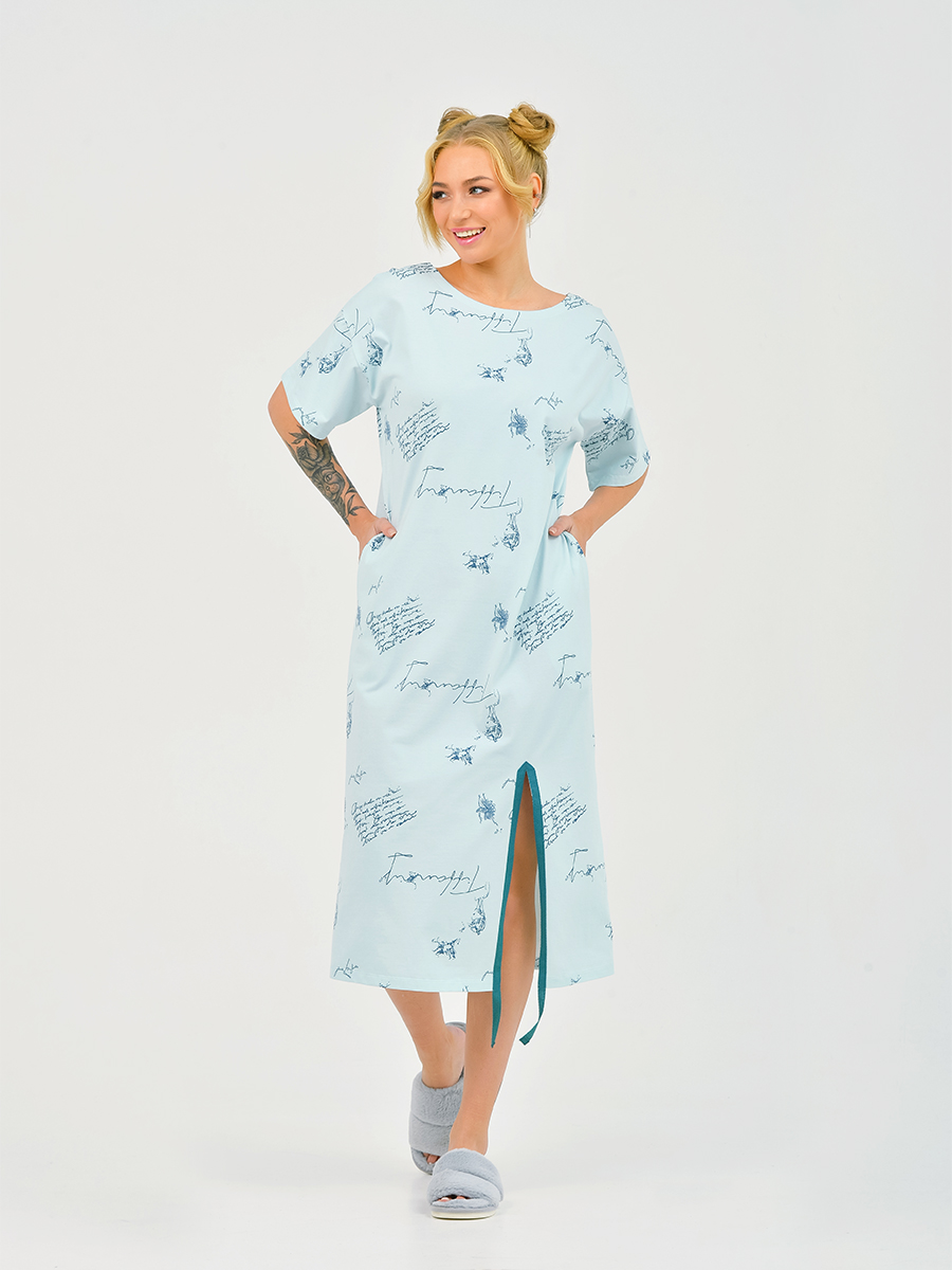 Удлиненное платье-футболка прямого кроя с кокетливым разрезом на полочке обрамлен контрастной лентой. Округлая спереди горловина переходит в V-образную сзади. Такая деталь всегда добавляет интриги в изделия. Линия плеча немного спущена, рукав широкий, прямой. Легкое просторное платье из хлопкового трикотажа с лайкрой прекрасно держит форму и отлично сидит на любой фигуре. Базовая вещь, которую можно носить дома и гулять на улице.