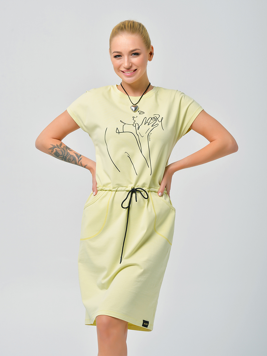 Платье средней длины со спущенной линией плеча. По талии кулиска с тонким контрастным шнуром в цвет принта для комфортной посадки. Длину платья можно увеличить или уменьшить за счет напуска. Модель украшена нашивкой (KISS) в стиле коллекции. Платье выполнено из высококачественного хлопкового трикотажа с добавлением эластана, качества пенье. Тонкое и лёгкое, можно носить как домашнюю или как повседневную одежду.