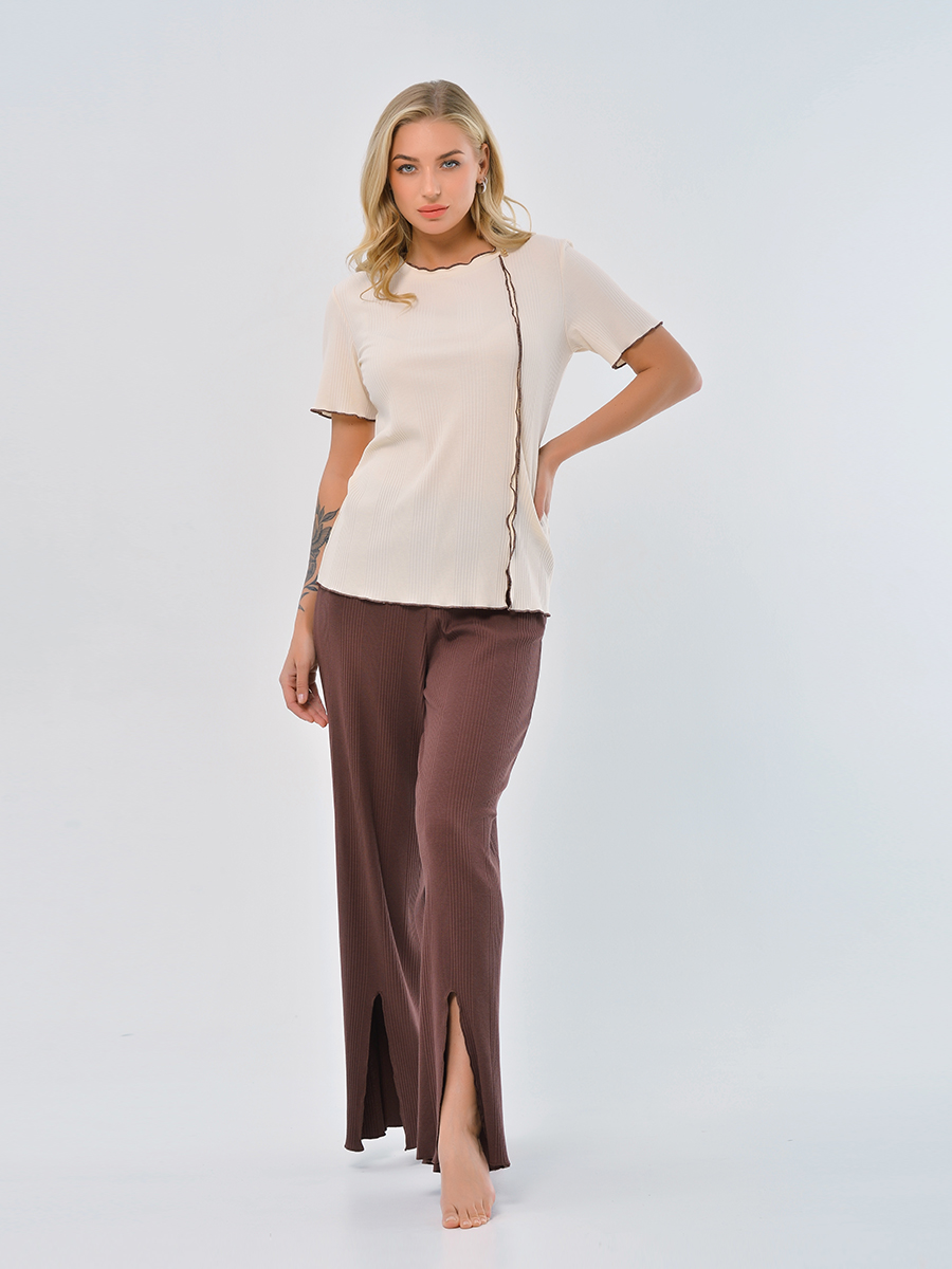 Домашний комплект с фактурой рубчик состоит из свободной футболки с контрастной отделкой и брюк с трендовыми разрезами спереди. Струящиеся широкие брюки палаццо с мягкой эластичной тесьмой на талии не сковывают движений, а разрезы спереди добавляют шарм и изюминку. Свободная футболка с контрастной отделкой украшена небольшим металлическим сердечком на горловине. Модель с контрастным сочетанием верха и низа прекрасно смотрится на любой фигуре.