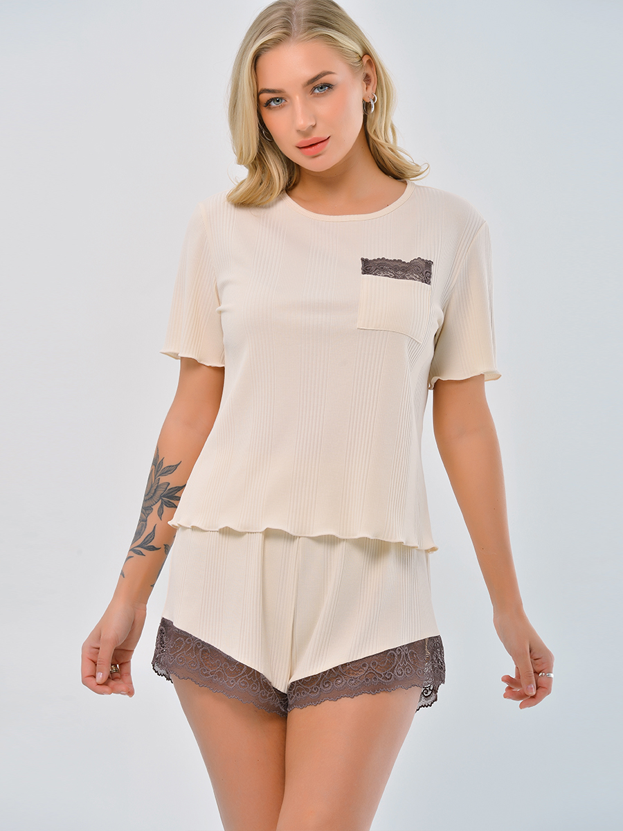 Трендовая пижама состоит из футболки и шорт с ажурным кружевом. Комфортная длина и приятная струящаяся ткань сделают пижаму любимым домашним нарядом. Легкие свободные шорты средней посадки, мягкий пояс не сдавливает тело, украшены нежным кружевом по низу изделия. Свободная укороченная футболка с втачным рукавом украшена небольшим карманом на груди с кружевной отделкой.