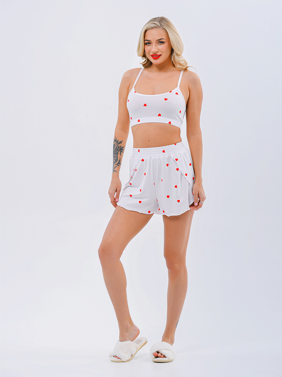Стильная и трендовая молодежная пижама из короткого топа и игривых шорт, украшена очаровательным узором в сердечках! Эта пижама станет идеальным выбором для комфортного сна и приятного отдыха дома. Топ с тонкими бретелями на регуляторах, что позволяет идеально подогнать размер под фигуру. Свободная модель шорт с широким эластичным поясом, которая не стесняет движений. Кокетливый запах на бедрах добавляет изюминку и создает игривый образ. Модель изготовлена из набивного полотна Rayon, которое приятно струится по телу и обеспечивает отличную воздухопроницаемость.