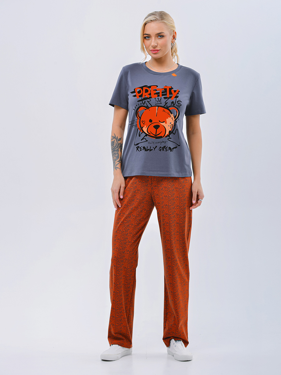 Яркий молодежный домашний костюм, созданный для комфорта и стиля в повседневной жизни. Изготовлен из высококачественной ткани хлопок с добавлением эластана, это обеспечивает отличную посадку и свободу движений. Футболка имеет удобную горловину, выполненную из рибаны, и украшена ярким стойким принтом на полочке, который радует глаз и подчеркивает индивидуальность. Брюки прямого кроя изготовлены из набивного трикотажного полотна с мягкой тесьмой на талии, что обеспечивает дополнительный комфорт при носке.