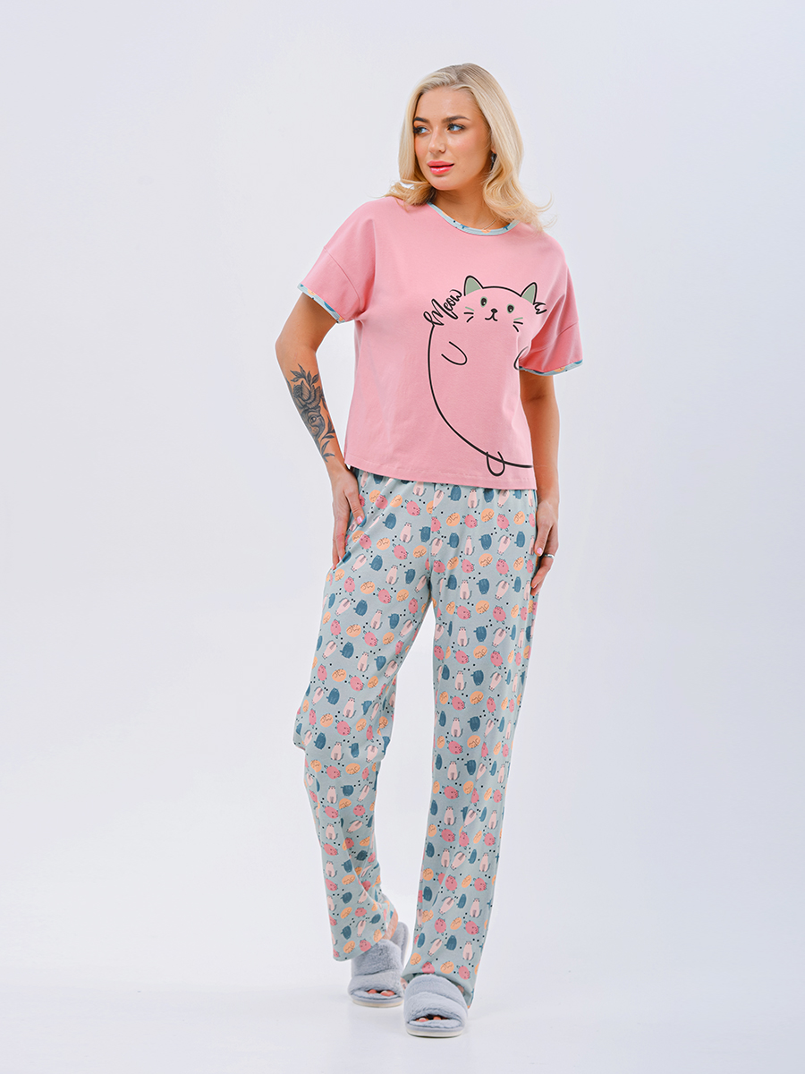 Домашний трикотажный костюм - это идеальный выбор для тех, кто ценит комфорт и стиль в повседневной одежде. Комплект состоит из свободной футболки с акцентными рукавами и укороченных брюк, что делает его универсальным для отдыха дома или прогулок. Футболка имеет свободный крой и классическую длину, обеспечивая свободу движений и комфорт. Горловина окантована, что добавляет аккуратности и завершенности образу. Украшена футболка забавным линейным принтом котика в стиле коллекции, который придаёт ей игривый и позитивный вид. Брюки прямого силуэта отличаются исключительно комфортной посадкой благодаря мягкой тесьме по талии. Их укороченная длина делает модель стильной и подходящей для тёплой погоды.