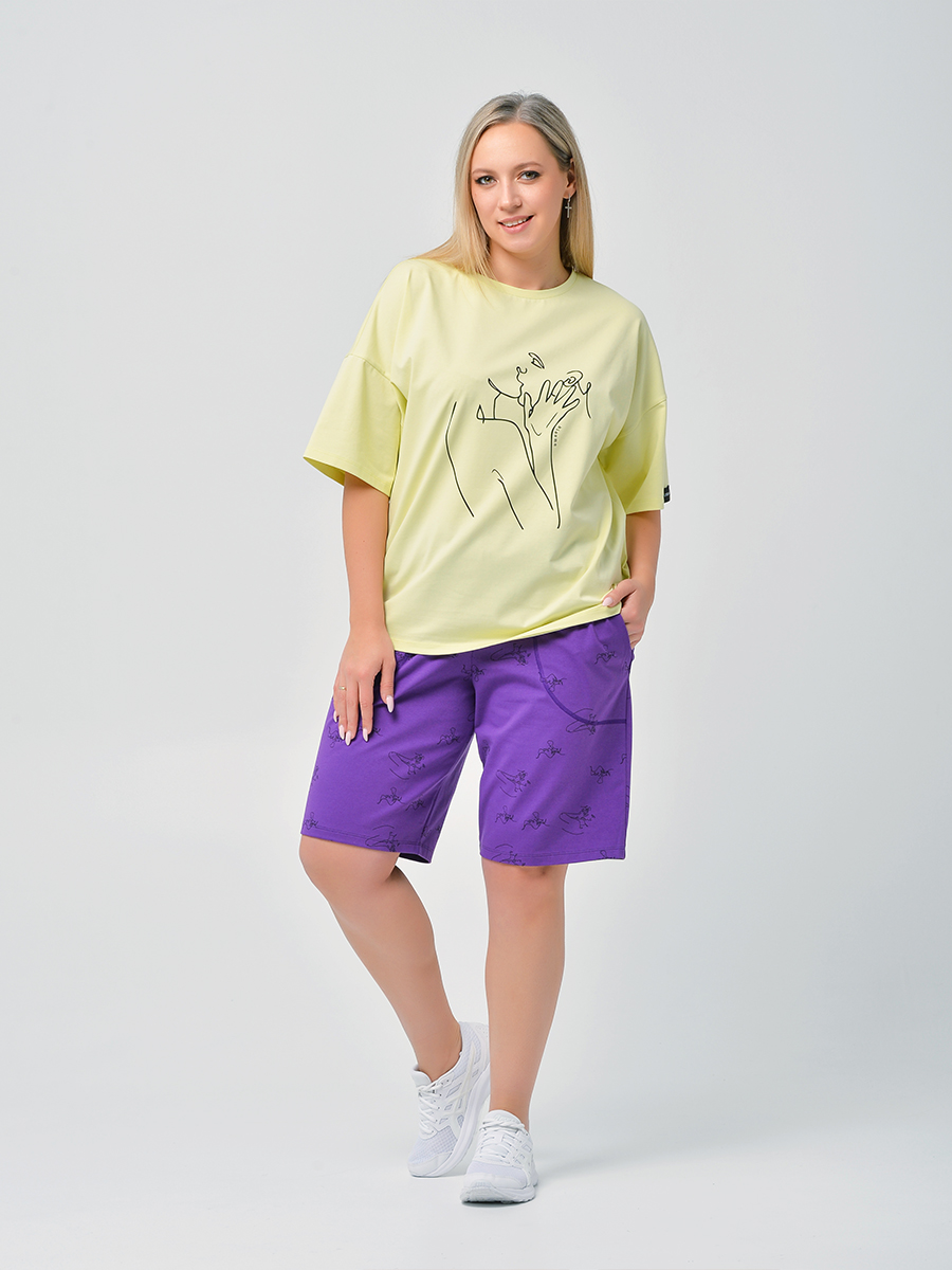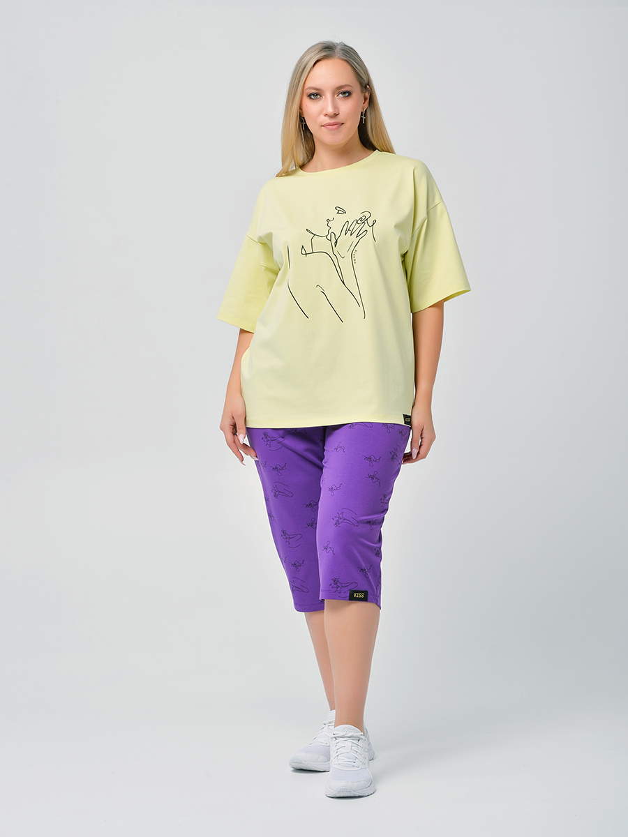 Яркий костюм с бриджами и футболкой. Практичная и удобная модель отлично подойдет как для дома, так и для прогулок на свежем воздухе или занятий спортом. Костюм изготовлен из хлопка с добавлением эластана, благодаря чему обладает хорошей воздухопроницаемостью и отлично сохраняет форму. При правильном уходе не потеряет форму и яркость цвета. Футболка оверсайз со свободным втачным рукавом украшена стильным принтом и фирменной нашивкой (KISS) по низу изделия. Бриджи свободного кроя, на талии мягкая эластичная тесьма, к низу чуть заужены и украшены нашивкой в стиле коллекции (KISS). Костюм не сковывает движения, а материал приятен на ощупь. Широкий размерный ряд позволяет удовлетворить потребности женщин любой комплекции.