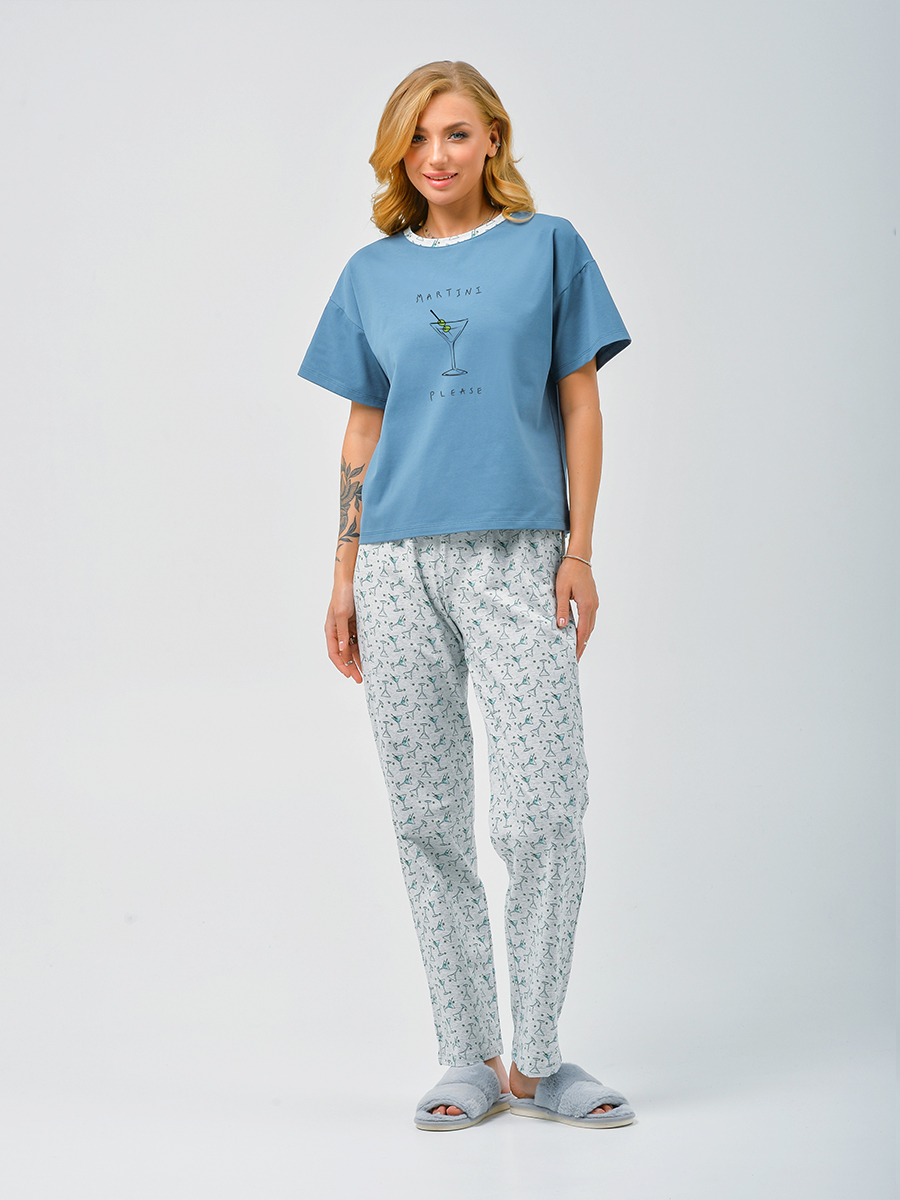 Комплект, состоящий из футболки и свободных брюк. Костюм изготовлен из хлопка с добавлением эластана, благодаря чему обладает хорошей воздухопроницаемостью и отлично сохраняет форму. При правильном уходе не потеряет форму и яркость набивки. Футболка свободного кроя со спущенной линией плеча и прямым втачным рукавом. Модель украшена стойким принтом «Martini please»(Мартини, пожалуйста). Брюки прямые свободного кроя, на талии мягкая эластичная тесьма. Пижама не сковывает движения, а материал приятен на ощупь. Практичная и удобная модель добавит комфорта домашнему отдыху.