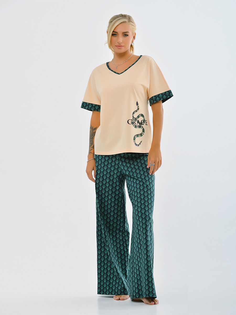 Костюм брючный в пижамном стиле с футболкой оверсайз представляет собой идеальный выбор для тех, кто ценит комфорт и уют в домашней обстановке. Модель изготовлена из хлопка с добавлением эластана, что обеспечивает не только мягкость и приятную на ощупь поверхность, но и долговечность материала. Особенностью данного костюма является его свободный крой, который даёт максимальный комфорт. Брюки с высокой посадкой с эластичной тесьмой на талии обеспечивают отличное прилегание и удобство. Футболка свободного силуэта со спущенной линией плеча, V-образным вырезом горловины с контрастной отделкой украшена стильным принтом с надписью Grace (грация).