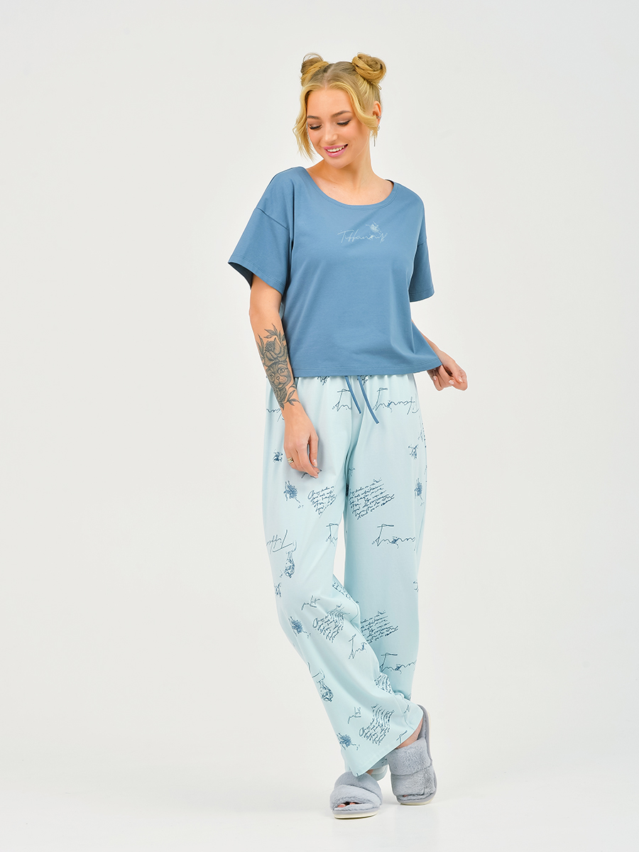 Стильный и лаконичный женский домашний костюм с широкими брюками и свободной футболкой. Такой комплект в приятной серо-голубой цветовой гамме - отличный вариант одежды для сна, а также для отдыха дома. Мягкий, эластичный хлопковый материал гипоаллергенен, подойдет для чувствительной кожи. Легкие широкие брюки с высоким поясом и мягкой эластичной тесьмой на талии украшены небольшим бантом из тесьмы. На свободной футболке- стойкий принт. Удобный крой изделия и деликатные швы дарят полную свободу движений.