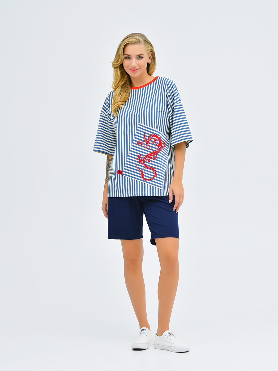 Яркий трикотажный комплект из футболки и шорт. Комфортная длина комплекта и приятная ткань сделают набор любимым. Легкие свободные шорты из приятного к телу трикотажного полотна «футербамбук» с удобными карманами. Свободная футболка оверсайз со спущенной линией плеча очень уютная и не сковывает движений, дополнена оригинальным большим карманом с принтом и текстильной нашивкой. Универсальный комплект для дома и отдыха. При бережной стирке ткань не теряет форму и яркость цвета. Рост модели 171 см