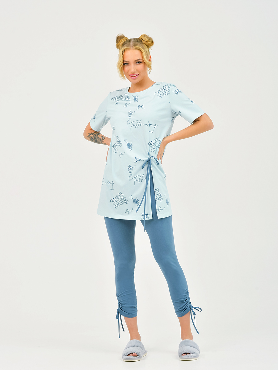 Оригинальный домашний комплект с лосинами на затяжках и удлиненной футболкой. Футболка свободного прямого кроя с втачным рукавом, на полочке разрез от бедра с завязкой добавит образу кокетливости. Лосины с затяжками по низу изделия, на талии мягкая эластичная тесьма. Практичная и удобная модель отлично подойдет как для дома, так и для прогулок на свежем воздухе. Костюм изготовлен из хлопка с добавлением эластана, благодаря чему обладает хорошей воздухопроницаемостью и отлично сохраняет форму. При правильном уходе не потеряет форму и яркость набивки. Комфортный и удобный домашний костюм в нежной серо-голубой гамме цветов.
