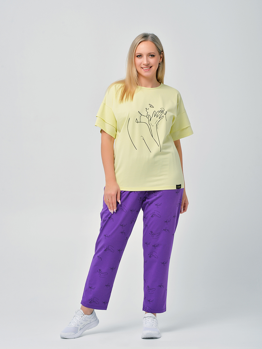 Женский комбинированный трикотажный костюм - это стильное и удобное решение на каждый день. Свободный прямой крой сделает этот комплект любимым и универсальным. Легкие прямые брюки из шелковистого полотна «футер бамбук» с удобными карманами и мягкой эластичным поясом. Свободная рубашка оверсайз с нагрудным карманом и разрезами по бокам. Модель украшена яркими текстильными нашивками. Комплект комфортной посадки, дарит легкость, свободу движениям и удобство в процессе носки. При бережной стирке ткань не потеряет форму и яркость цвета. Рост модели 171 см.