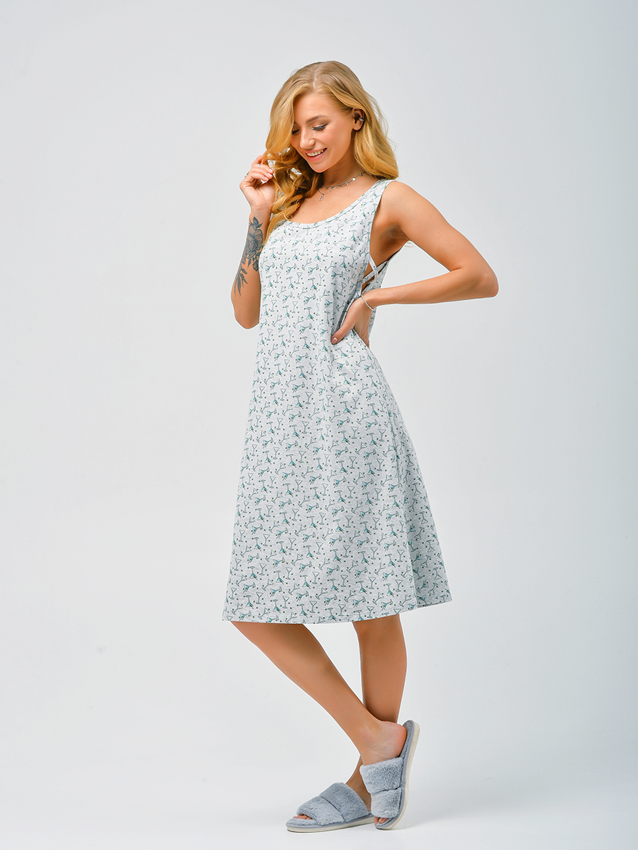 Ночная сорочка из хлопкового набивного полотна с добавлением эластана на тонких бретелях. Модель комфортной длины, полуприлегающего силуэта, подходит для большинства типов женских фигур. Натуральные материалы в составе гарантируют хорошую воздухопроницаемость и гигроскопичность, что необходимо для комфортного сна. Ткань сохраняет цвет и форму даже после множества стирок.