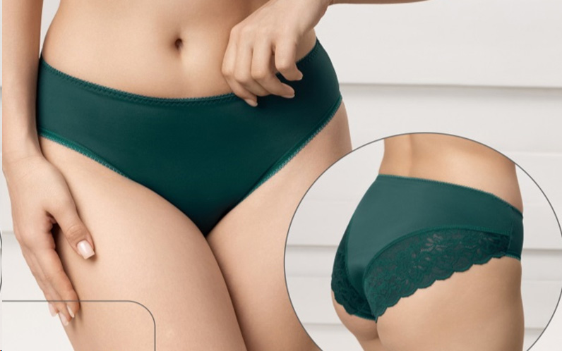 Трусы со средней линией талии. Боковые детали передней части украшены вставками из эластичного кружева. «Ножки» обработаны мягкой эластичной лентой. Подкладка ластовицы из хлопчатобумажного полотна.