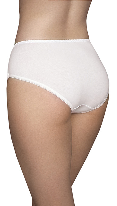 Трусы классические. Передняя деталь состоит из трёх частей: центральная - из хлопка в виде треугольника с основанием вверху, две другие боковые - кружевные части. Задняя деталь из хлопка. Пояс обработан швом «зигзаг». По нижнему срезу передней детали (кружевной части) эластичная тесьма с внутренней стороны, для нежного прилегания по ножке. Нижние срезы задней детали обработаны на плоскошовной машине, что позволяет данную модель рекомендовать под облегающую одежду.