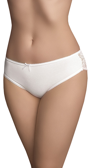 Трусы классические со средней посадкой. Передняя деталь из хлопка. Задняя деталь кружевная, с треугольной хлопковой вставкой. Пояс обработан эластичной тесьмой. За счёт ажурных нижних срезов на задней детали модель прекрасно подходит под облегающую одежду.