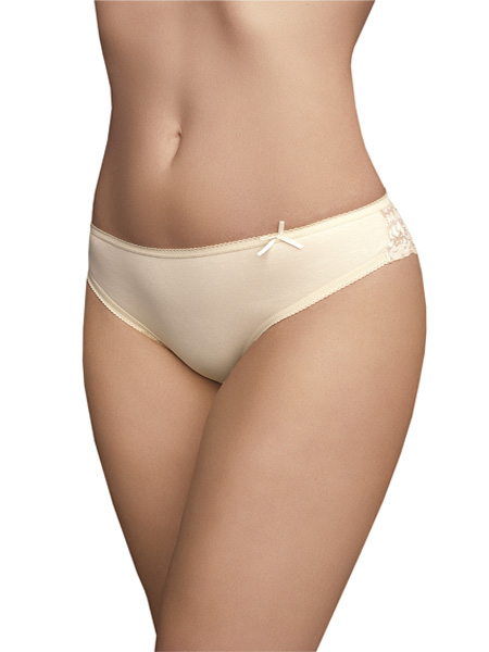 Трусы – бразильяна со средней посадкой. Передняя деталь выполнена из трикотажного полотна, задняя - кружевная. Это придаёт женским формам особую соблазнительность. Края ножек и пояса обработаны кантом с ажурным краем.
