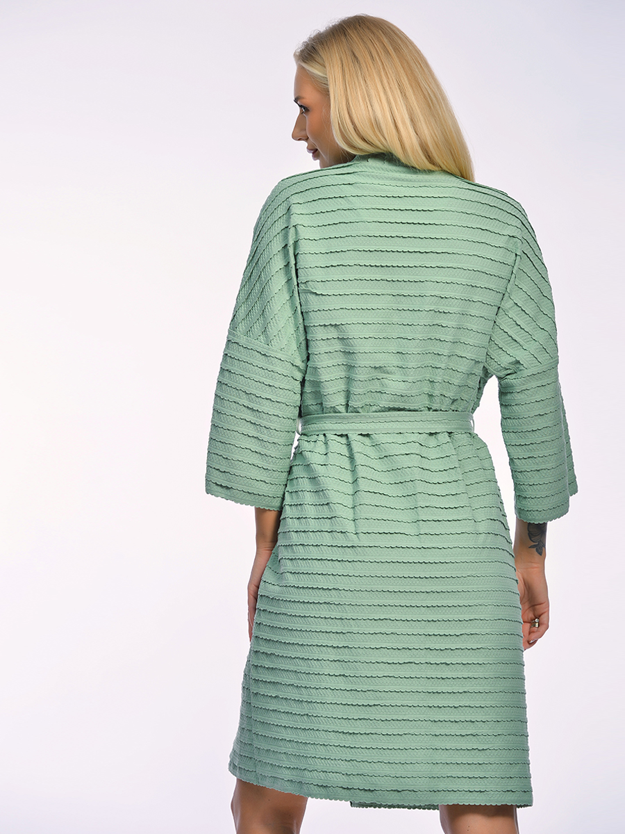 Трикотажный халат-кимоно на запах выполнен из фактурного ажурного хлопкового полотна. Свободный крой с расширенными рукавами три четверти делает модель