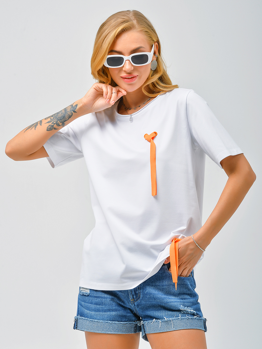 Фуфайка женская с круглым вырезом и коротким рукавом. Изделие полуприлегающего силуэта будет не заменимо на отдыхе, в быту и для занятий спортом.