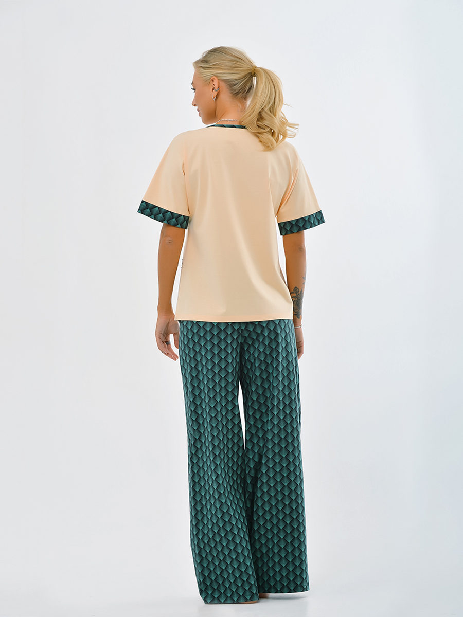 Костюм брючный в пижамном стиле с футболкой оверсайз представляет собой идеальный выбор для тех, кто ценит комфорт и уют в домашней обстановке. Модель изготовлена из хлопка с добавлением эластана, что обеспечивает не только мягкость и приятную на ощупь поверхность, но и долговечность материала. Особенностью данного костюма является его свободный крой, который даёт максимальный комфорт. Брюки с высокой посадкой с эластичной тесьмой на талии обеспечивают отличное прилегание и удобство. Футболка свободного силуэта со спущенной линией плеча, V-образным вырезом горловины с контрастной отделкой украшена стильным принтом с надписью Grace (грация).