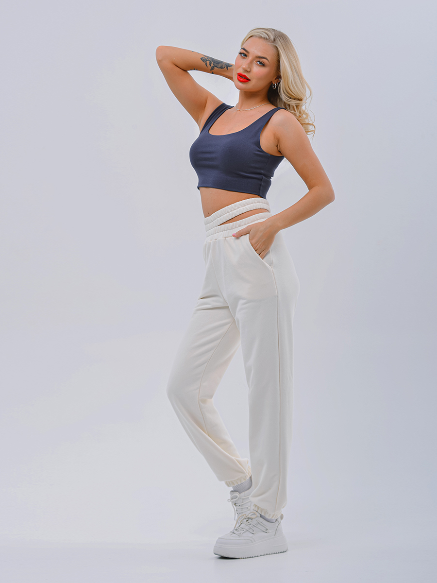 Эти женские джоггеры идеально сочетают в себе комфорт и стиль. Модель выполнена из мягкого и приятного к телу футера петля. Удобные наклонные карманы в боковых швах. Высокий пояс шириной 8 см на эластичной тесьме подчеркивает талию и создает красивый силуэт, а дизайнерское решение с раздваивающимся поясом слева добавляет оригинальности и изюминки в общий вид. Низ брюк на мягкой тесьме гарантирует свободное движение и комфорт в любом положении.