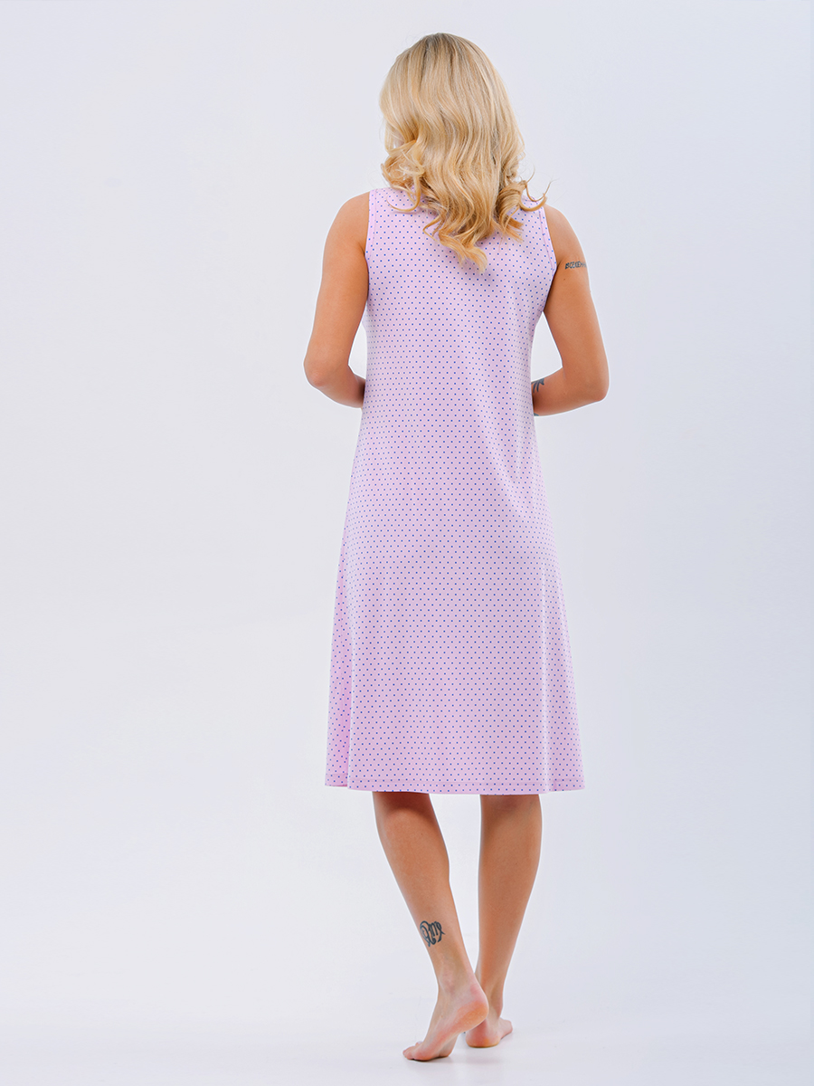 Женская ночная сорочка выполнена из набивного полотна. Сорочка имеет полуприлегающий силуэт, который свободно облегает фигуру, позволяя коже дышать и обеспечивая максимальную свободу движений. Она обладает отличной гигроскопичностью, что делает ее идеальным выбором для сна в любое время года. Дизайн модели продуман до мелочей: комфортная длина, округлая горловина и свободные проймы, безупречный крой создают ощущение легкости и свободы.