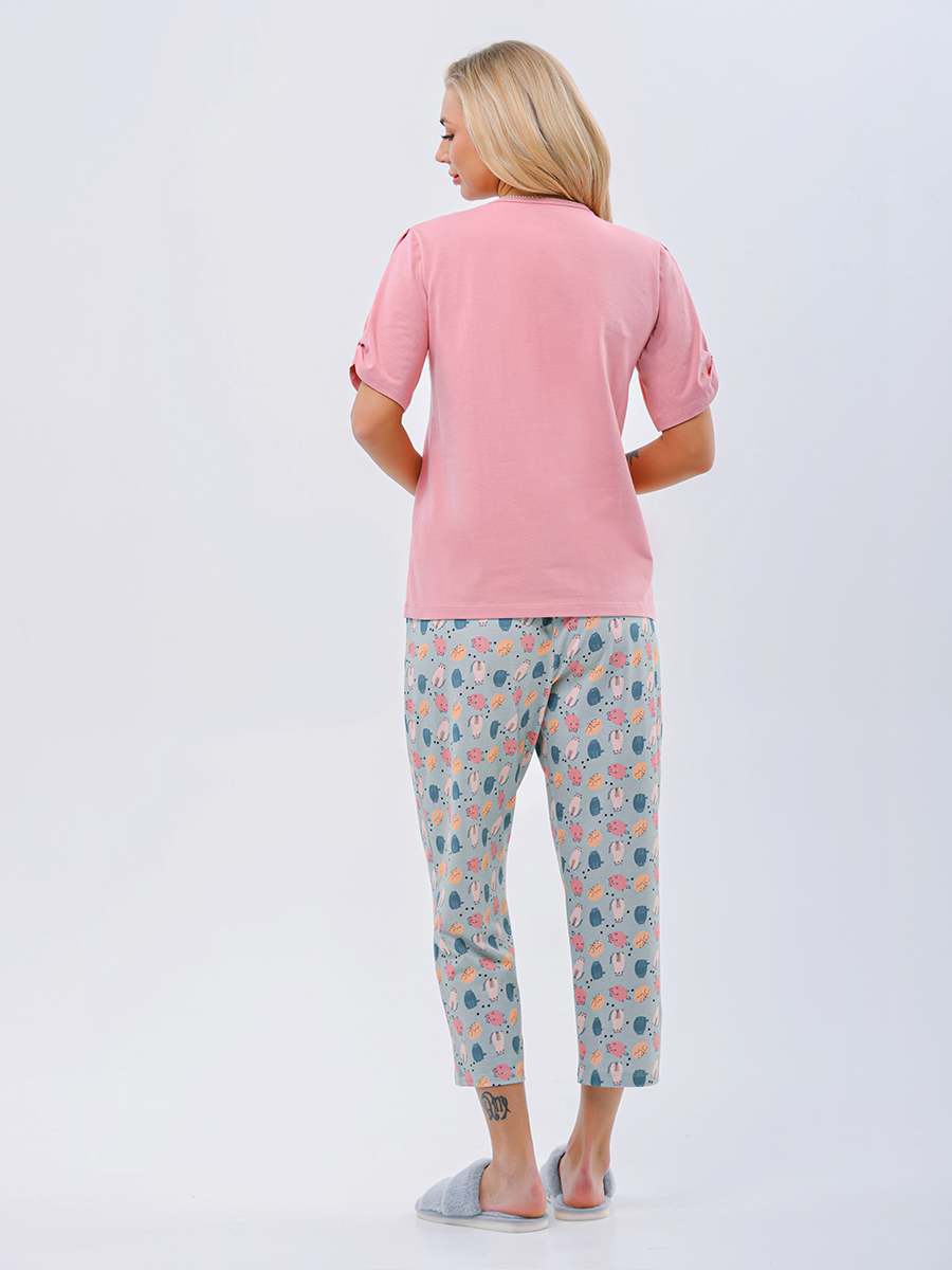рукавами и укороченных брюк, что делает его универсальным для отдыха дома или прогулок. Футболка имеет свободный крой и классическую длину, обеспечивая свободу движений и комфорт. Горловина окантована, что добавляет аккуратности и завершенности образу. Украшена футболка забавным линейным принтом котика в стиле коллекции, который придаёт ей игривый и позитивный вид. Брюки прямого силуэта отличаются исключительно комфортной посадкой благодаря мягкой тесьме по талии. Их укороченная длина делает модель стильной и подходящей для тёплой погоды.