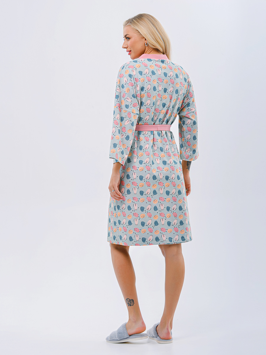 оптимальный микроклимат, что особенно важно для домашней одежды. Данная модель имеет прямой силуэт с спущенной линией плеча и широкими рукавами 3/4. В комплекте предусмотрен пояс, позволяющий регулировать посадку и подчеркивать талию. Свободный крой не сковывает движений, обеспечивая максимальный комфорт.