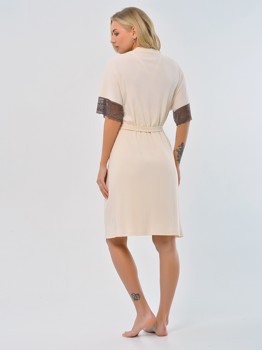 Нежный халат прямого силуэта со спущенной линией плеча и манжетом из ажурного кружева, в комплекте имеется пояс. Свободный крой не стесняет движений. Халат прекрасно подчеркнет все прелести фигуры, благодаря своему изысканному крою и удобной посадке. Красивый шелковистый материал приятно ложится на тело, а игривое кружево придает образу элегантности.
