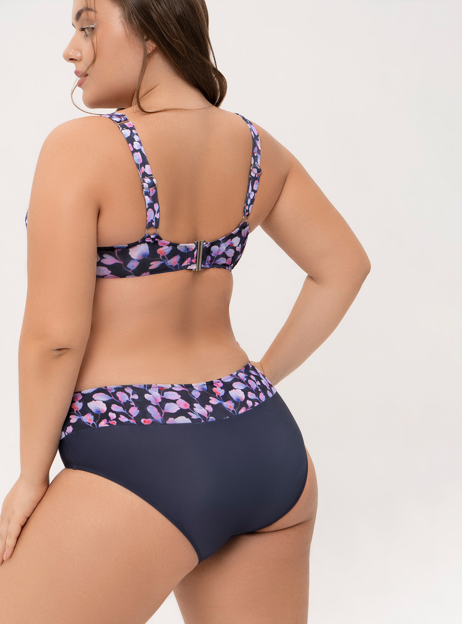 Купальник с вместительной мягкой чашкой на каркасах. Т-образный шов чашки придает груди красивую форму. Стержни в боковых деталях не допускают скручивания пояса в процессе носки. Трусы-слипы средней посадки с принтованной кокеткой. Все детали бюстгальтера и трусов продублированы подкладкой