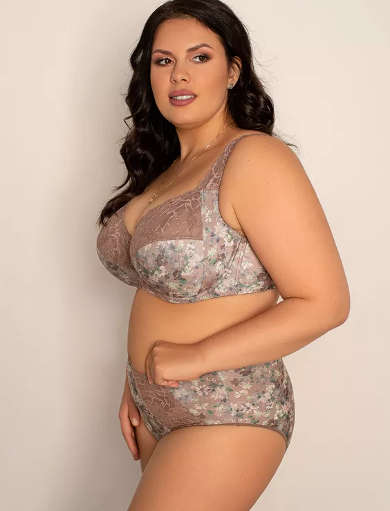 Мягкая чашка из эластичного кружева и эластичной микрофибры. Чашка внутри дублирована хлопком. В модели предусмотрены подгрудные косточки. Верх чашки и пояс бюстгальтера выполнены с дополнительным нижним слоем из эластичной сетки с целью улучшения формоустойчивости, что актуально для больших размеров.