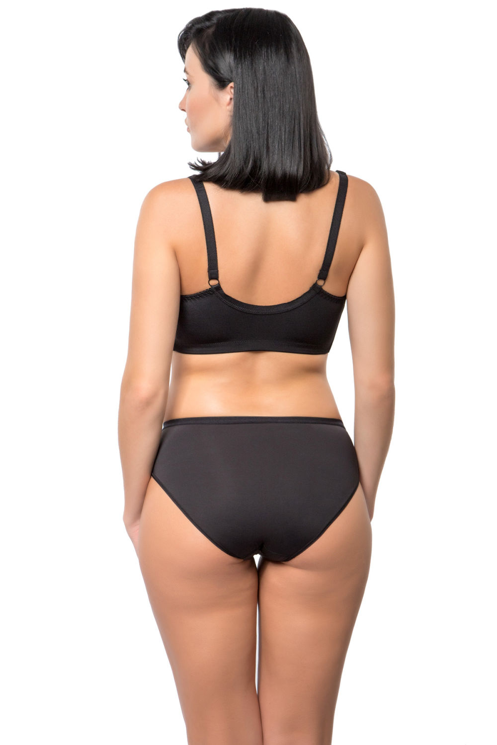 Бюстгальтер без каркасов. Мягкие чашки из двух деталей на подкладке из хлопка. Боковая корректирующая деталь продублирована поролоном. Упругие пластины. Застежка спереди.