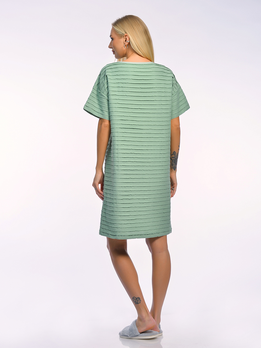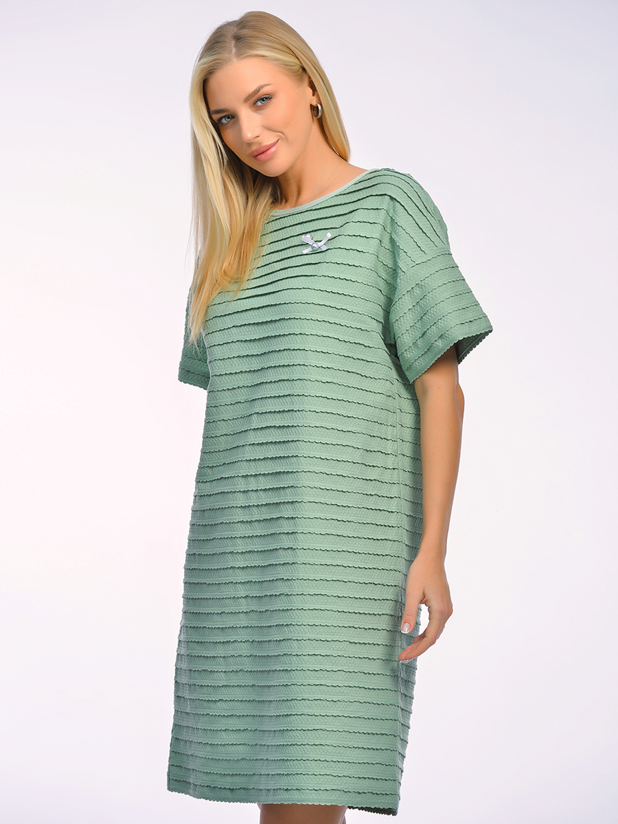 Стильное домашнее платье свободного силуэта из высококачественного фактурного хлопка. Модель выполнена с чуть спущенной линией плеча. Длина выше колена. Особым акцентом служит декоративная брошь-булавка на груди.