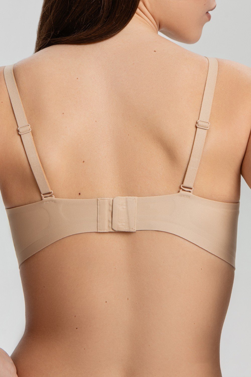Бесшовный бюстгальтер из микрофибры. Зона декольте декорирована эластичной сеткой. Силиконовые вставки выполняют функцию косточек. В комплекте съемные латексные вкладыши.