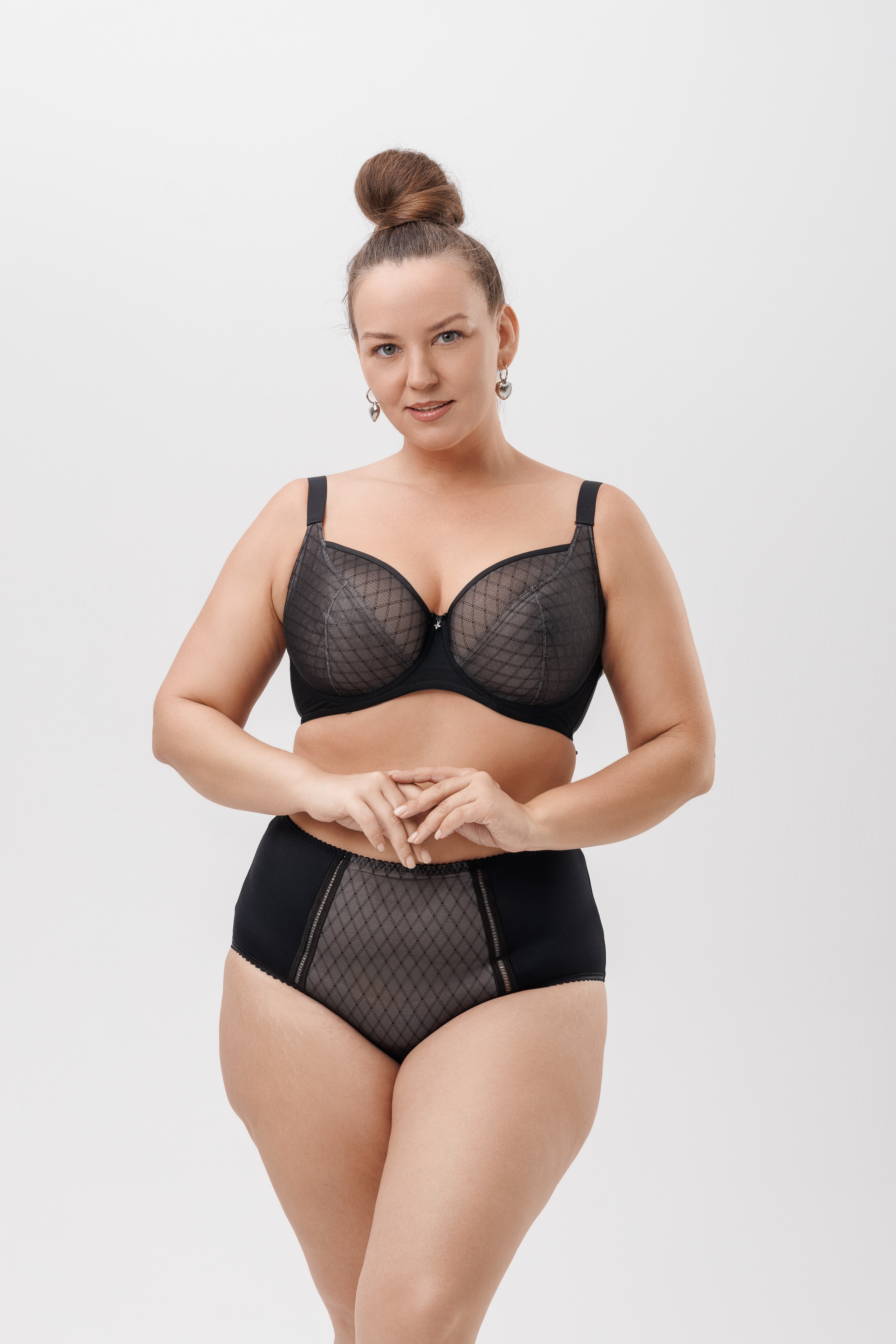 Бюстгальтер без каркасов, с мягкими чашками. Верхняя деталь чашки и «ушко» – из эластичного кружева, все остальные детали – х/б трикотажа. Бретель имеет поролоновую «подушечку». В боковой и нижней частях чашки поролоновый уплотнитель. Бретель эластичная с регуляторами длины. Отделка – бантик.